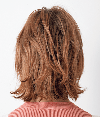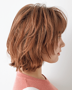顔まわりにたっぷりのレイヤーで遊びを入れたボブは、後れ毛のようにパラッと落ちる毛束がこなれ感を上昇。柔らかみのあるオレンジベージュのカラーでツヤ感をトッピングしたら、全体にストレートアイロンを通して毛先をすっと外ハネに。オイルで束感をつくるとおしゃれ。