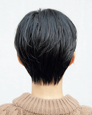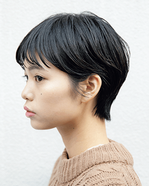 ダークトーン、ストレート、ショートと男前要素を揃えつつ、トレンドをおさえてしっかり女らしいのは、丸みのあるマッシュショートだから。スライドカットとチョップカットで顔まわりにヌケ感と束感を出すようにスタイリングを。グリースをもみ込んでツヤを演出して、ヘルシーな甘さをトッピング。
