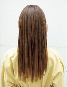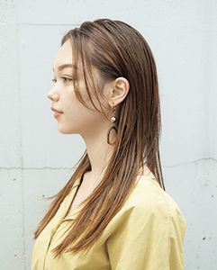 潔くてカッコいいスリークストレートは憧れの的。胸ラインのレイヤーロングに、毛先が先細りになるようにカットしてタイトにおさめる。シアーグレージュのハイトーンカラーは自然なグラデで透明感をメガ盛りで。オイルでツヤ感を出し、クールな男前感をダメ押し。