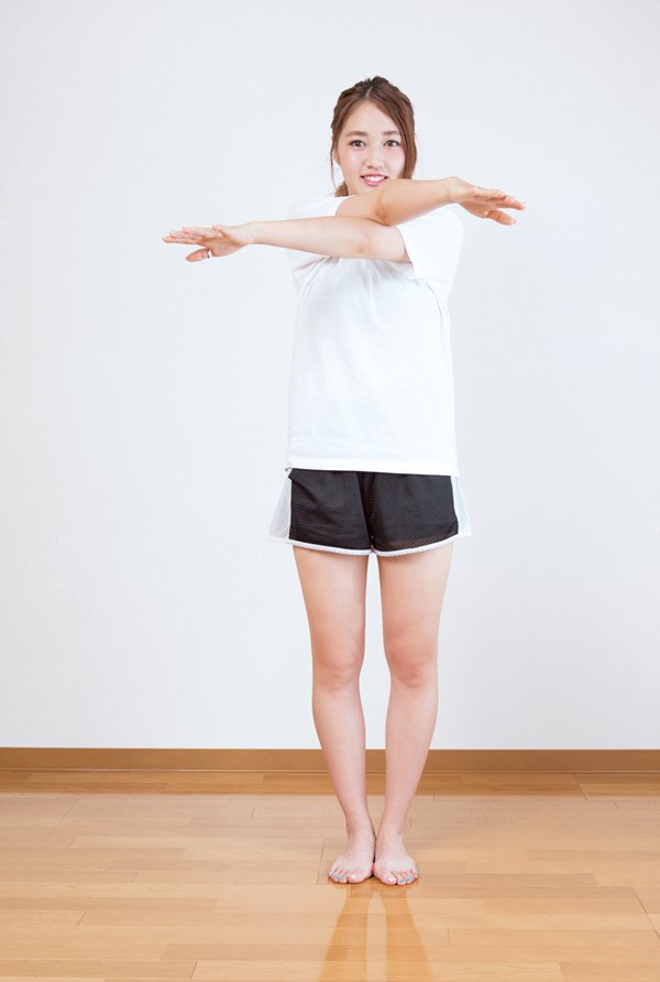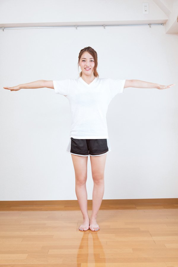 リラックスした姿勢で立ち、肩や指先の力を抜いた状態で、両腕を左右に大きく広げる。
