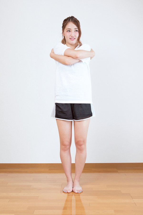 クロスした両腕でそのまま自分を抱きしめるように、両手を両腕のつけ根のあたりへ置く。