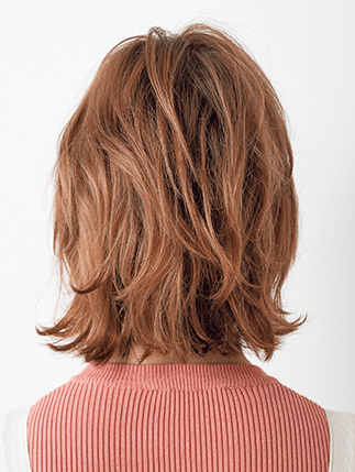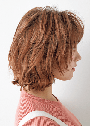 顔まわりにたっぷりのレイヤーで遊びを入れたボブは、後れ毛のようにパラッと落ちる毛束がこなれ感を上昇。柔らかみのあるオレンジベージュのカラーでツヤ感をトッピングしたら、全体にストレートアイロンを通して毛先をすっと外ハネに。オイルで束感をつくるとおしゃれ。