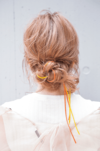三つ編みをほどよく崩した、ゆるシニヨン。中央をくるりんぱ、両サイドをねじり編みにしたあと、2色のリボンを入れ込んで三つ編みに。顔まわりにたっぷりおくれ毛を残して、無造作にゆるく仕上げつつも、やつれモードに見えないように、スタイリングでツヤっぽさをプラスオン!