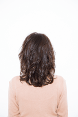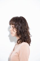 鎖骨下レングスに設定し、角度をつけた前上がりにカット。やや高めの位置からレイヤーを入れ、前髪にも隙間をつくって。毛先は平巻き、ハチ上はMIX巻きにしたコールドパーマでソフトな動きを。セピアブラウンでまろやかさもオン。
