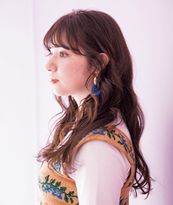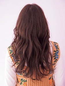 波打つようなウエーブとオン眉の透け感バングの組み合わせは、モテ甘ガールの超テッパン! 顔まわりはリバースにして明るく華やかに、全体は大小のカールを組み合わせて動きを均一に揃えずヌケ感を出してるあたりが、あざと可愛い♥