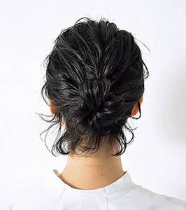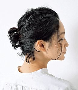 表面をアイロンで波巻きにする。襟足と顔まわりの髪を薄く残し、それ以外を耳下の低めの位置でゴムで結んで。結んだ毛束の毛先を放射状にピンで留めていき、丸みのあるおだんごに。残しておいた襟足の毛束を内、外にランダムに巻いて、軽やかな動きをプラス。