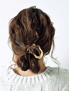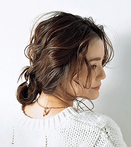 もみあげと表面の髪を32㎜のアイロンで波巻きにする。前髪は少し立ち上げるようにふわっとさせると色っぽい。バックの低い位置でひとつにまとめて、毛束を内側に半分に折っておだんごにする。毛束を引き出して、ゆるっと仕上げるとアンニュイ感が増し増しに。