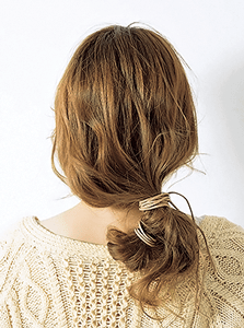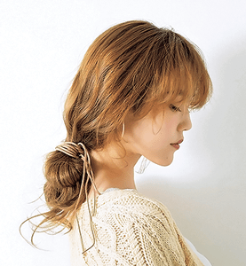 全体にうねりがつく程度にアイロンで巻く。髪を片サイドに寄せ、肩につくギリギリの付近でまとめ、毛先を折りたたんで革ひもで結ぶ。キュッと結ぶと野暮ったくなってしまうので、あくまでゆるゆるっとまとめること。前髪はセミドライな質感のスタイリングに。