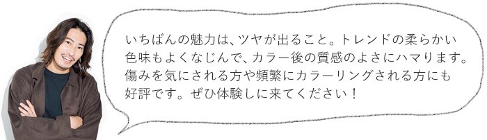 モノトーンにウォームブラウンを混ぜて、柔らかなくすみ感をまとったベージュ系カラーに。根元と顔まわり3㎝は少し暗めに染めて、コントラストをつけることでアンニュイな⾊気とツヤっぽさをアップ。あご下にレイヤーを⼊れた鎖⾻ミディは、外ハネと内巻きのスタイリングでくびれをつくり、あざといほど⾊っぽいモテウルフに。