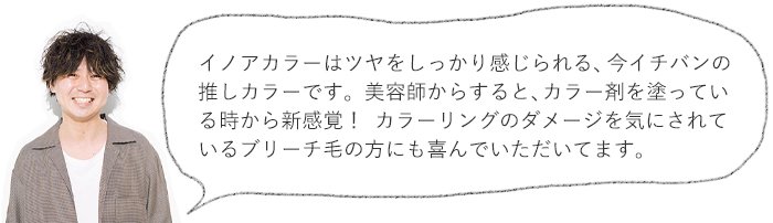 丸みのあるショートに合わせたのは、薄めのバイオレットで⻩みを抑え、モノトーンで深みを出した優しげなベージュ系カラー。もとのブリーチ⽑に重ねて明るさをキープすることで、⼥の⼦らしい柔らかさを与えつつ、⽢すぎないヘルシーなショートに。仕上げに、オイルやワックスで束感をつくるとシャレっ気が上昇。