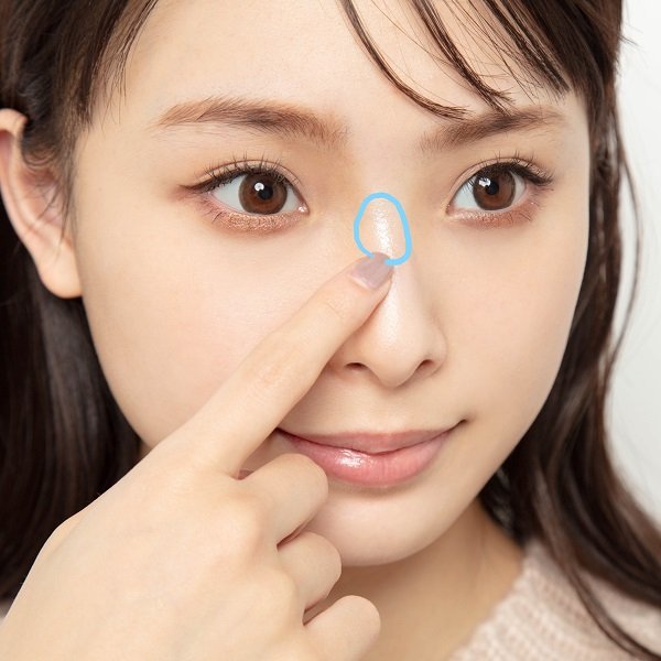 「まずは↑鼻根の中心に指でポンポンとのせます。少しだけ鼻筋まで伸ばしてもOKですよ」