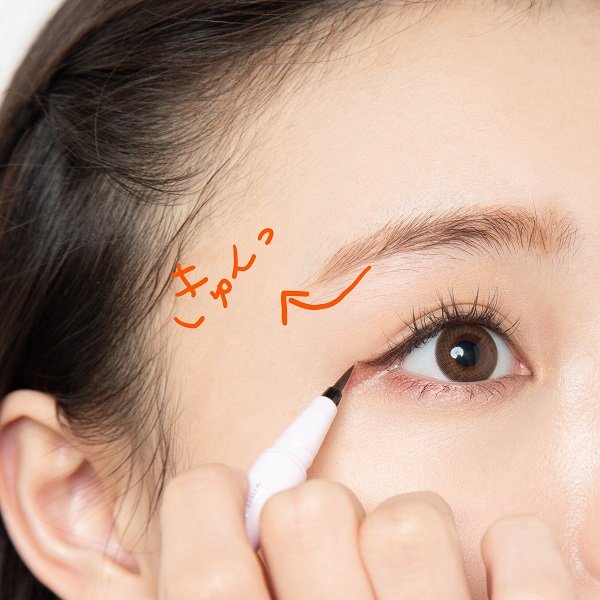 「目尻は短めに! まぶたのキワの終わり目を過ぎたらすぐに、きゅんっと斜め上方向にハネ上げます。