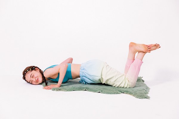 手とひざを床につく。足首を組んで(好きな方を上にしてOK)浮かせる。手は肩幅に広げて腕を伸ばした状態に。うまく身体が支えられない人はひざの位置を少し手の方へ近づけて。