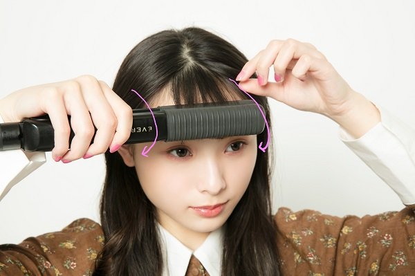 「フロントに残った毛を、ストレートアイロンで一気に挟み、内側にくるんと一回転させます。小分けにせず、全束を思い切って挟むのがコツ! まとまりのあるキレイなカールになりますよ」