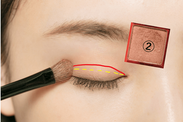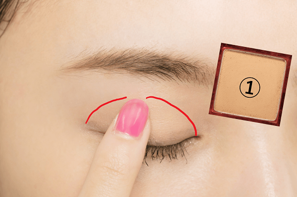 「②のピンクベージュを、二重幅よりやや広めにオン。このカラーは少しだけ光沢があるので、まぶたに立体感も出ます」