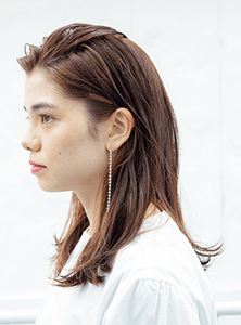 大人なロングに欠かせないものといえば、かき上げバング。男前ロングの場合は、あまりカールをつけず、お色気のちょっと手前くらいで止めておくのが決め手。重ためのベースに顔まわりのみレイヤーを入れて動きを出しやすくし、インナーカラー+赤みでちょっぴりモードに味つけを。