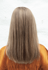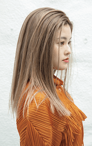 攻めたハイトーンとパツンとしたストレートが潔い。レイヤーを入れず毛先に厚みを持たせるようにカットし、前髪をほんの少しだけつくることで顔まわりにニュアンスをプラス。カラーはブリーチ+パールアッシュ。根元を少し暗くしてあるから、かき上げる仕草もカッコよくキマる!