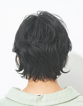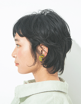 上からレイヤーを入れてふわっと感を出し、毛先には柔らかな平巻きのパーマをオン。ハサミで直線的にカットしたあと、ピンパーマで流した前髪に個性をのせて、誰ともかぶらないおしゃれウルフに変身♡弾ける笑顔と動きのあるオシャレヘアは春服にもマッチ。