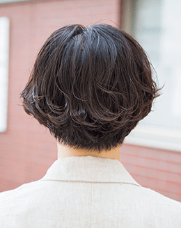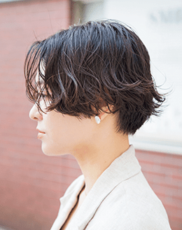 流行のハンサムショートを進化させた+αなショート。襟足はすっきり、後頭部には丸さを出し、前髪とサイドは長さを揃えてカットし、表面にはレイヤーをプラス。スパイラルパーマでアンニュイな動きを出し、オイル+バームでツヤっぽく仕上げれば、クール感と女らしさをブレンドした甘辛スタイルが完成。