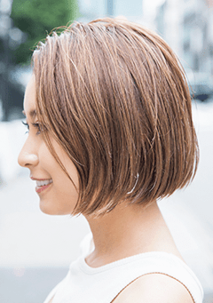 このサロンでボブのオーダーの約8割を占めるという、圧倒的人気を誇るミニマルボブ。ハチ上に前下がりのグラデーションを入れ、襟足をキュッと引き締めてコンパクトに。ベージュ系のベースに細かいハイライトをたくさん入れることで、柔らかさと透明感、立体感と三拍子揃った こなれボブに総仕上げ♡