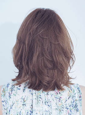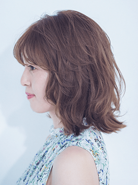 顔まわりを前上がりにカットしてウルフボブらしい縦長シルエットを出しつつ、ぱつんと重みを残した毛先で印象を柔らかく。カラーは温かみのあるシエナベージュを。肩レングスならスタイリングも簡単でさっとアイロンを通すだけ。自然なハネ感を生かしちゃえばOK。
