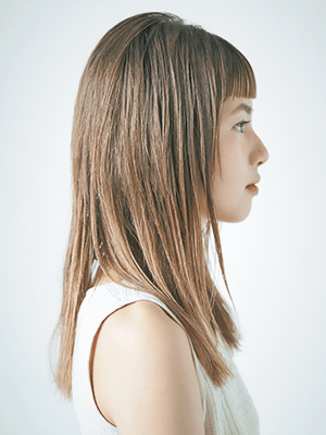 風が吹いた時や振り向きざまにハラッと動いて顔に髪がかかるように、重ためのストレートヘアの中にもレイヤーを忍ばせるのがカギ。 表面のレイヤーとハイトーンのラベンダーベージュで自然な軽やかさをプラス。パッツン前髪でギャップ萌え♡